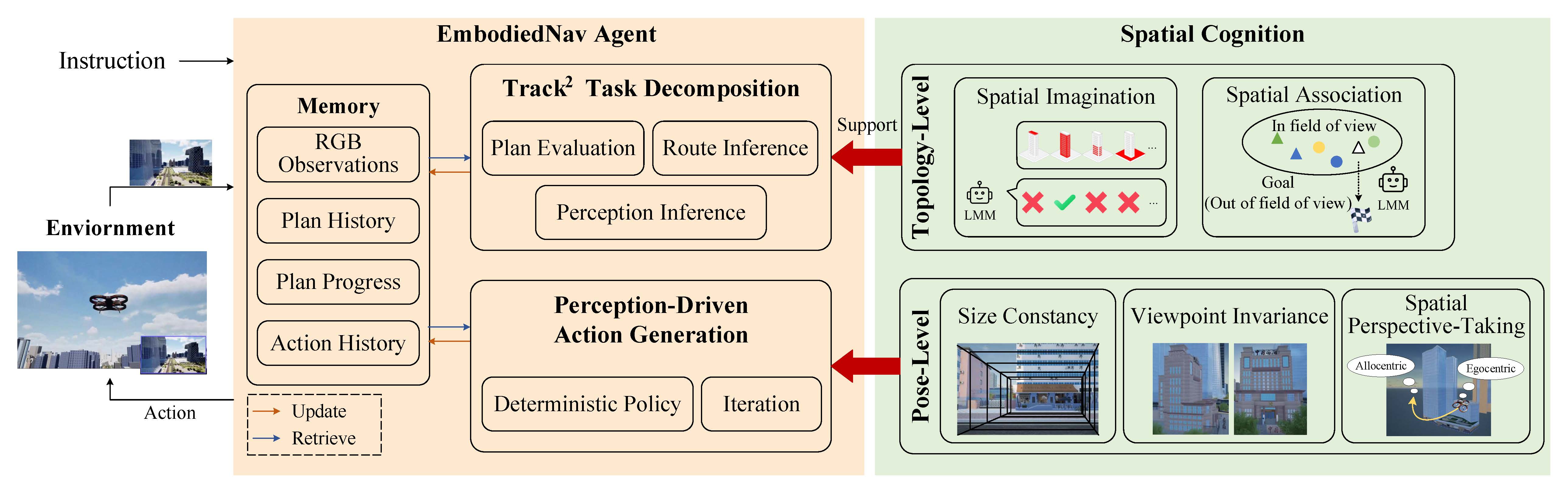 Asking an aerial agent to navigate to any location without providing a specific route in an unseen environment autonomously is one of the fundamental tasks in embodied artificial intelligence. However, embodied navigation in low-altitude urban spaces is understudied, with aerial agents facing significant perception and reasoning challenges due to open-ended three-dimensional spaces and partial observations. To fill this gap, we propose EmbodiedNav, a large multimodal model-empowered agent composed of three modules: Track^2 Task Decomposition, Perception-Driven Action Generation, and Memory. These modules are built on spatial cognition: the imagination and associative ability for macro-level spatial topology, and the acquisition of micro-level spatial positioning through size consistency, viewpoint invariance, and spatial perspective-taking. Our formulation mimics how humans navigate using only RGB visual information, without relying on maps, odometers, or depth inputs. Experimental results demonstrate the potential of our agent in urban aerial embodied navigation.