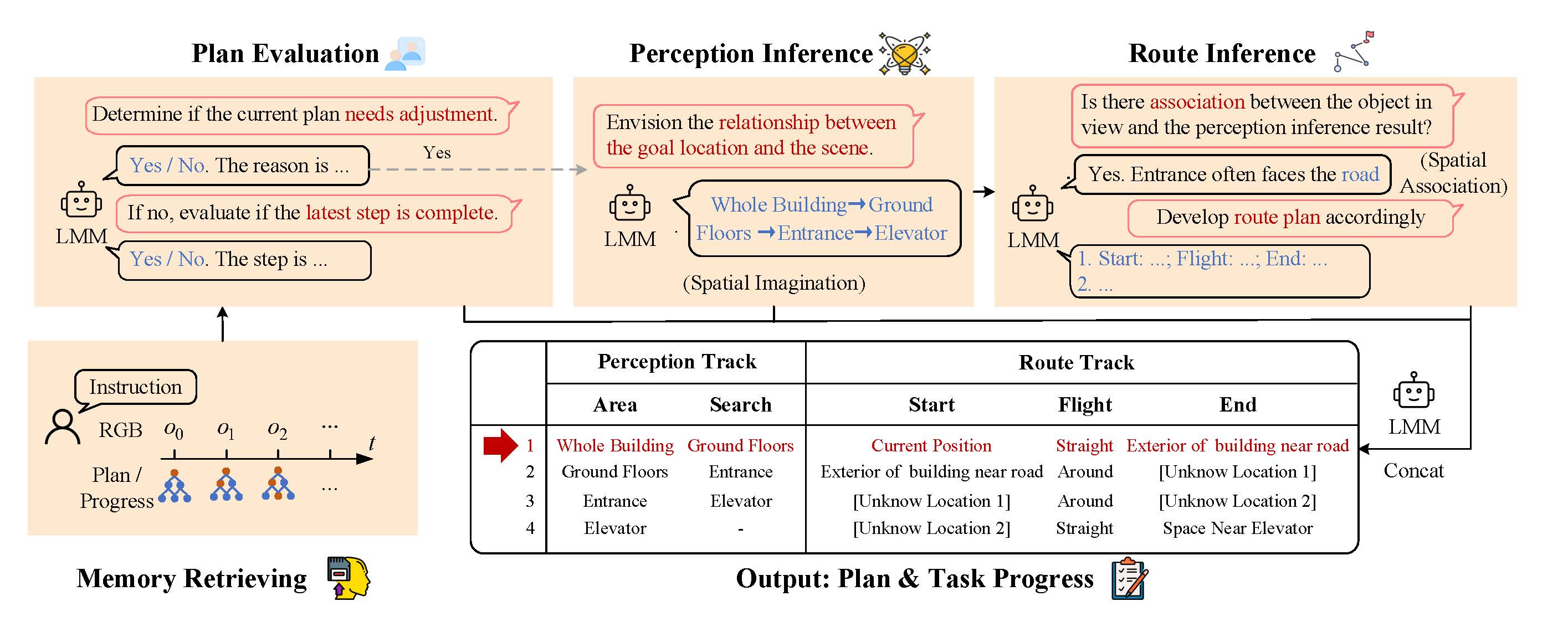 The design of embodied CoT for the Track^2 Task Decomposition module, mainly including plan evaluation, perception inference, and route inference. The perception inference and route inference stages are specifically designed based on spatial imagination and spatial association, respectively. The resulting plan is better equipped to handle goal-oriented navigation tasks in urban spaces.