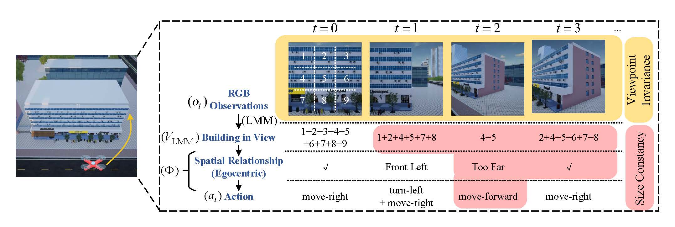 Perception-driven action generation: example of flying around an area of interest while maintaining a relatively constant distance and ensuring effective camera perception. To accommodate the LMM, the field of view is divided into a grid to determine the rough location of the area of interest.