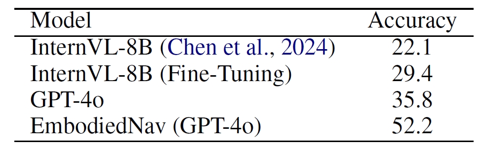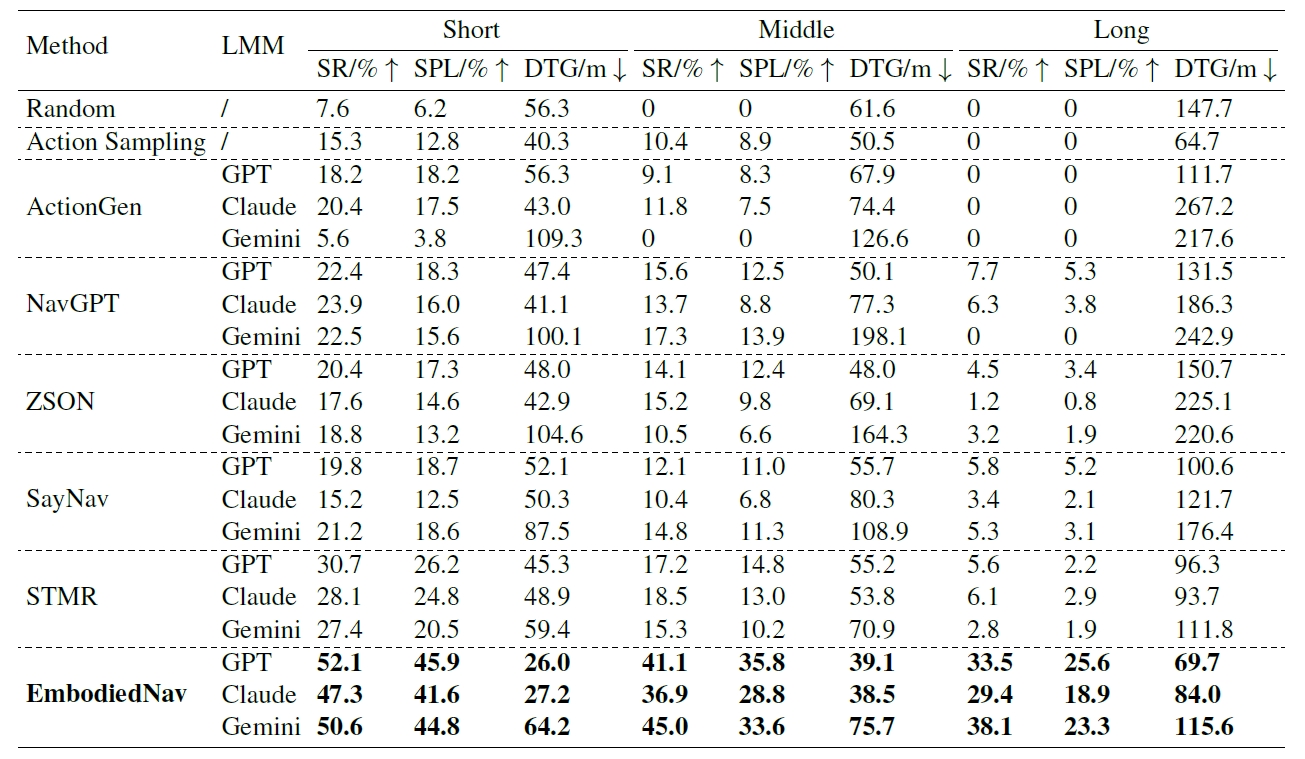 Embodied navigation results of the proposed EmbodiedNav compared to other baselines. The short, middle, and long groups correspond to ground truth trajectories of less than 63.2 meters, between 63.2 meters and 101.7 meters, and greater than 101.7 meters, respectively.