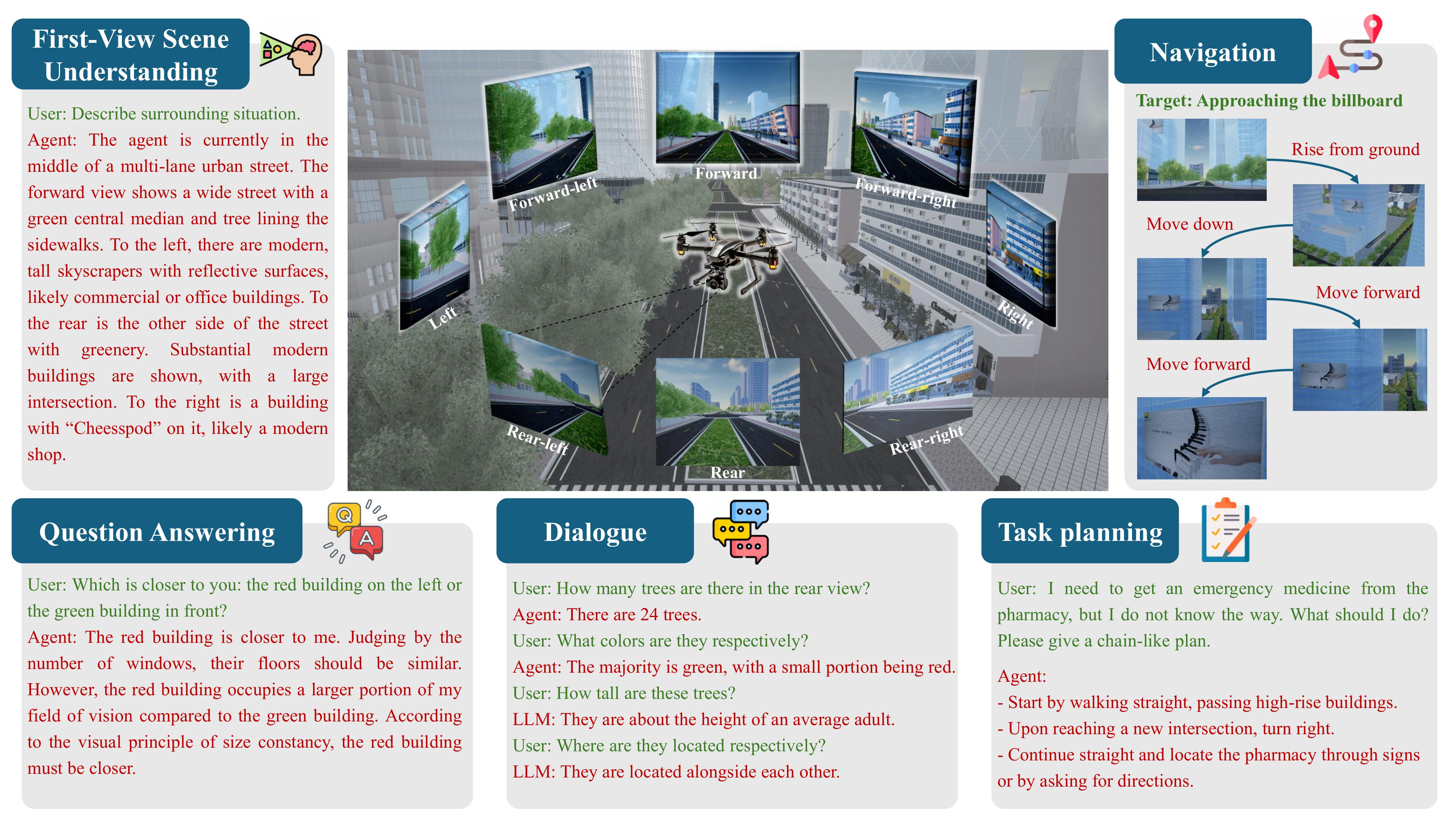 Within this benchmark, we delve into two critical embodied tasks. The first task is vision-and- language navigation (VLN), where an agent navigates following human language instructions. Traditional VLN agents, which perform well in indoor environments using navigation graphs, struggle in 3D continuous urban spaces. To address this, we introduce CityNav, a city-level VLN agent that employs semantic map-based spatial reasoning and a topological memory graph for robust navigation in urban environments. CityNav constructs a 3D local semantic map, utilizes LLMs for common-sense reasoning, and records navigable locations in a memory graph, significantly enhancing navigation performance.