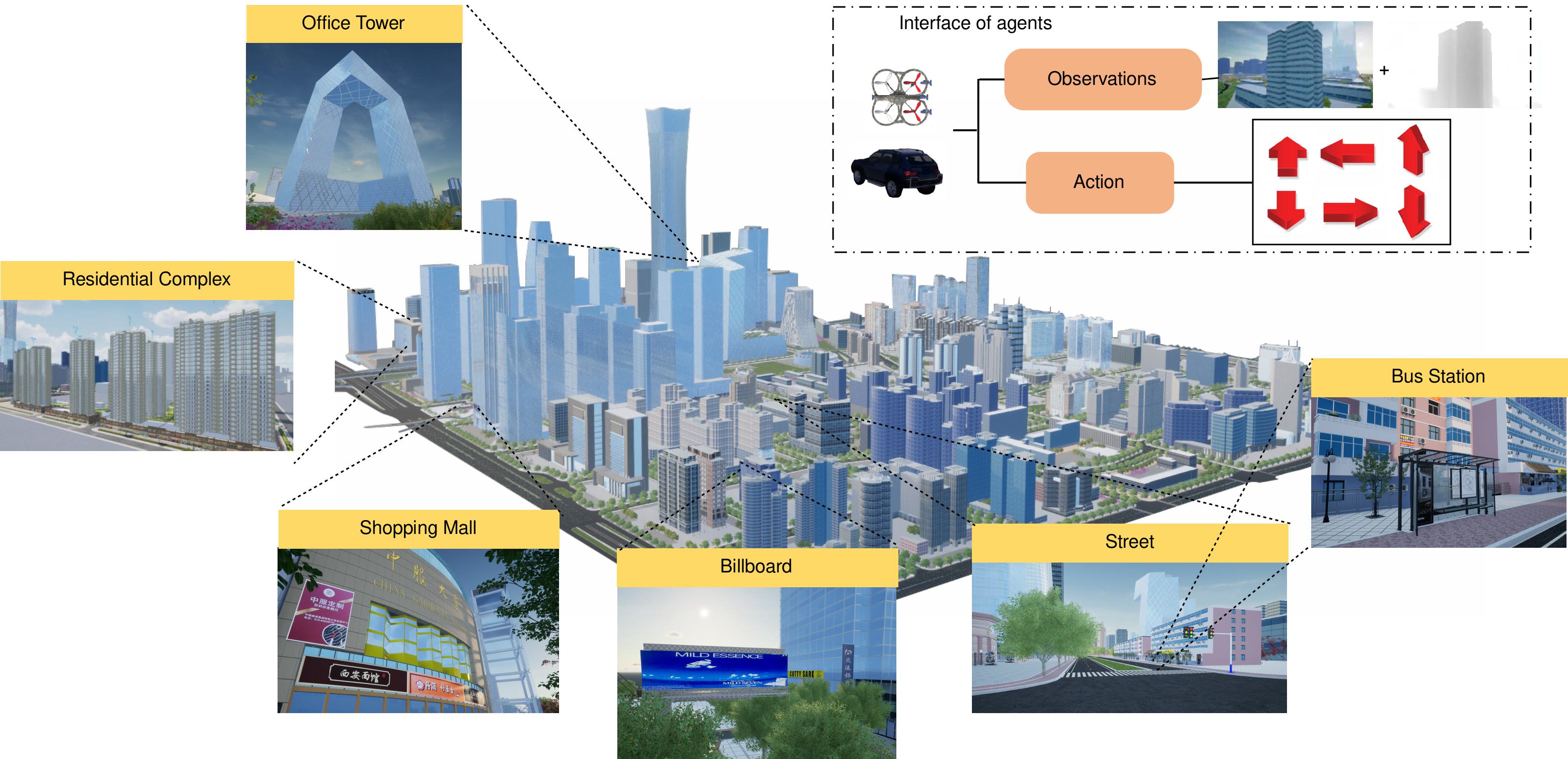 We first constructed a city-embodied environment simulator. This platform is developed based on a city simulator, providing 3D environments and interactions. The basic environment of the simulator includes a large business district in Beijing, one of the biggest city in China, in which we build 3D model for buildings, streets, and other elements, hosted by Unreal Engine 4.17. We further build the interface of embodied agents to ensure the agents can indeed embod themselves in the system. To implement it,we use the AirSim plugin provide by Microsoft. Specifically, AirSim is originally designed for airdrones, for which the observations are conducted through a first-view manner, and the control for airdrones includes motion, velocity, accelerated velocity, etc.